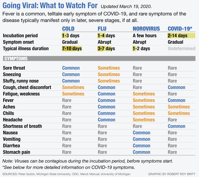 There are distinct differences in themost likely symptoms of various virus infections and how fast they come on. This chart — and the deeper explanations below on four viruses getting a lot of attention these days — can’t replace a doctor’s diagnosis, but they may help you contemplate what you’re in for. If you have questions or concerns, consult a health care professional, and don’t let an unknown disease fester.